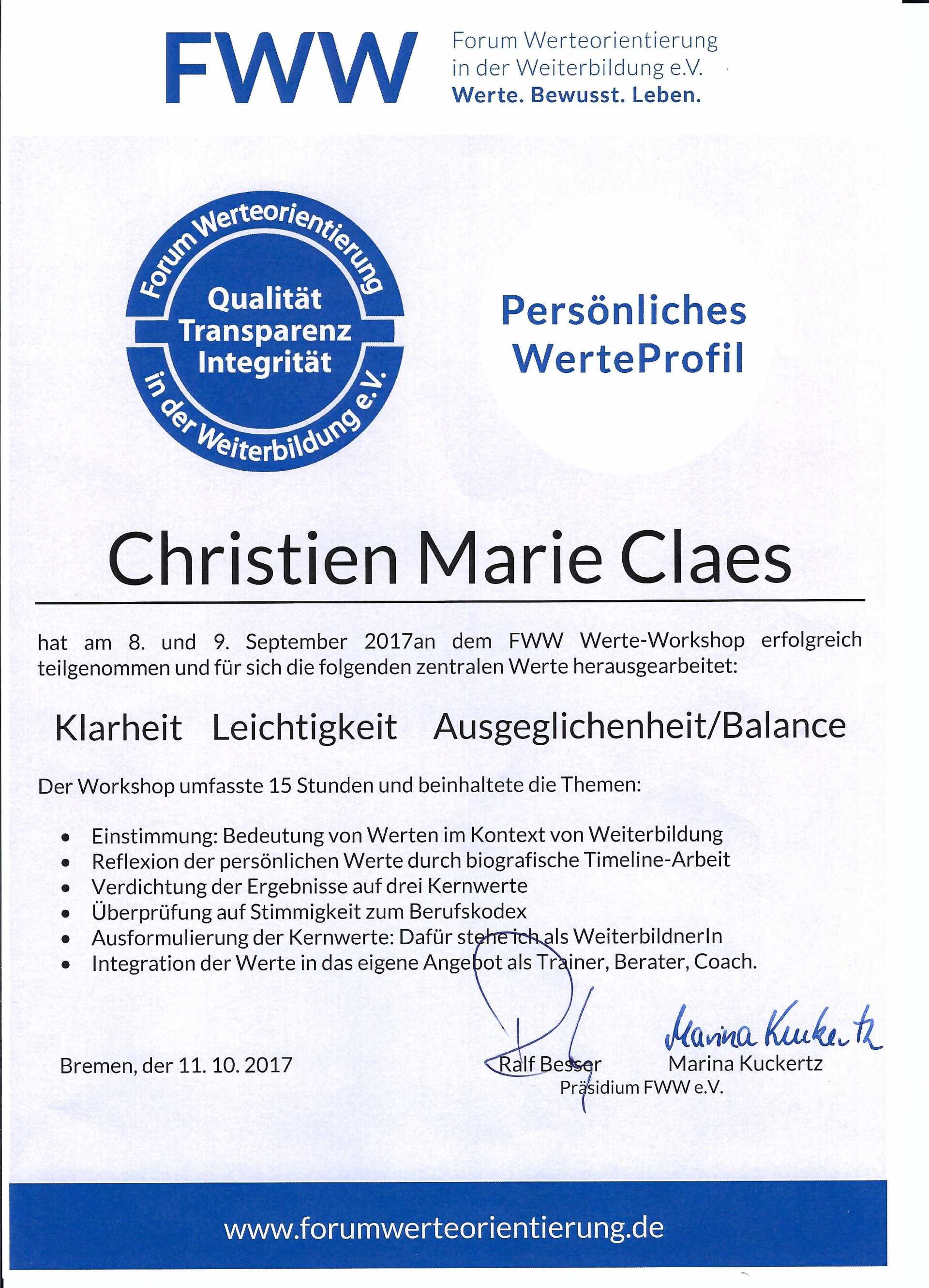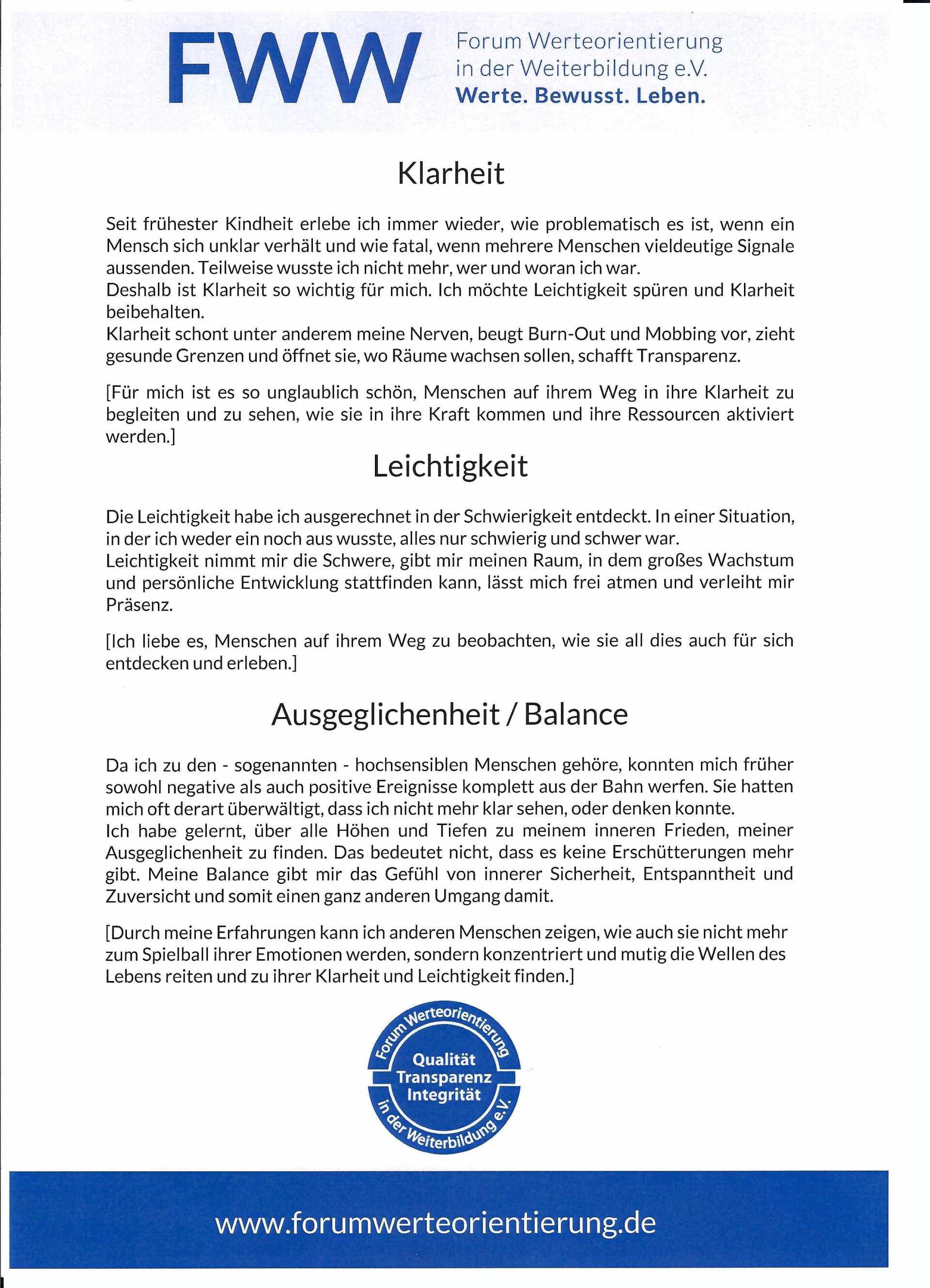 Ich habe 09/2017 meinen persönlichen Wertereflexionsprozess durchlaufen und mein persönliches Werteprofil, aufbauend auf dem Berufskodex des FWW, herausgearbeitet.